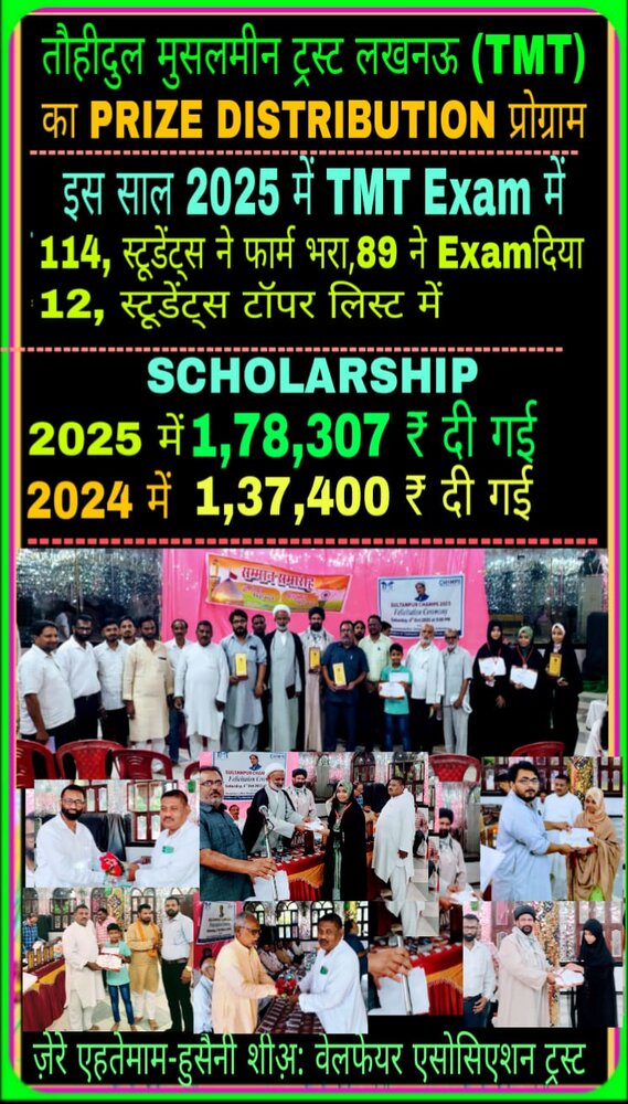 हौज़ा न्यूज़ एजेंसी के अनुसार ,हुसैनी शिया वेलफेयर एसोसिएशन के अध्यक्ष हैदर अब्बास खान की अध्यक्षता में हर वर्ष की तरह इस वर्ष भी तौहीदुल मुस्लिमीन ट्रस्ट लखनऊ द्वारा संचालित परीक्षा में सुलतानपुर के 114छात्र छात्राओं को फार्म भरवाया गया था जिसमें 89छात्र छात्राओं ने भाग लिया था जिसमें 12ने जनपद टाप किया।