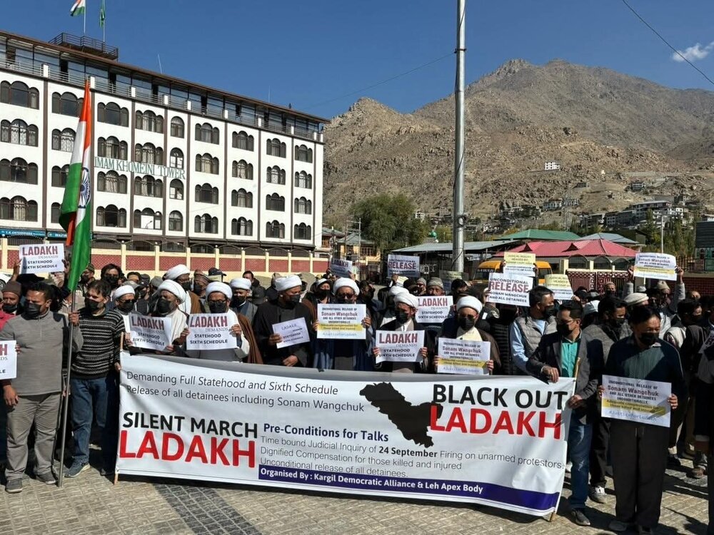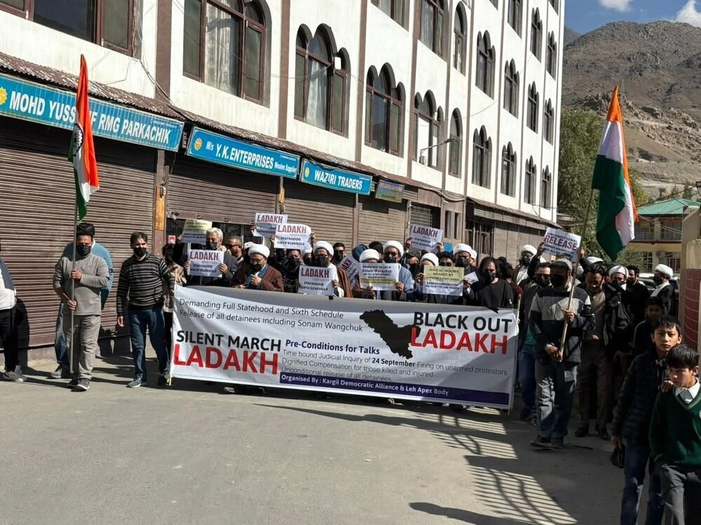 हौज़ा न्यूज़ एजेंसी के अनुसार ,कारगिल में कारगिल डेमोक्रेटिक अलायंस और लद्दाख एपेक्स बॉडी द्वारा एक शांतिपूर्ण मौन मार्च निकाला गया, जिसमें बड़ी संख्या में लोगों ने भाग लिया। प्रदर्शनकारियों ने लद्दाख को पूर्ण राज्य का दर्जा देने इसे संविधान की छठी अनुसूची में शामिल करने और सोनम वांगचुक सहित सभी गिरफ़्तार लोगों को रिहा करने की मांग की। इस मार्च से पहले प्रशासन ने सुरक्षा कड़ी कर दी थी और मोबाइल इंटरनेट सेवाएं बंद कर दी थीं।