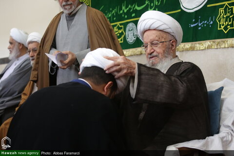 हौज़ा / क़ुम अलमुकद्देसा में हज़रत फातेमा ज़हेरा स.ल. की विलादत के मौके पर आयतुल्लाहि उज़मा नूरी हमदानी के दस्ते मुबारक से दीनी विद्यार्थियों की अम्मामा…